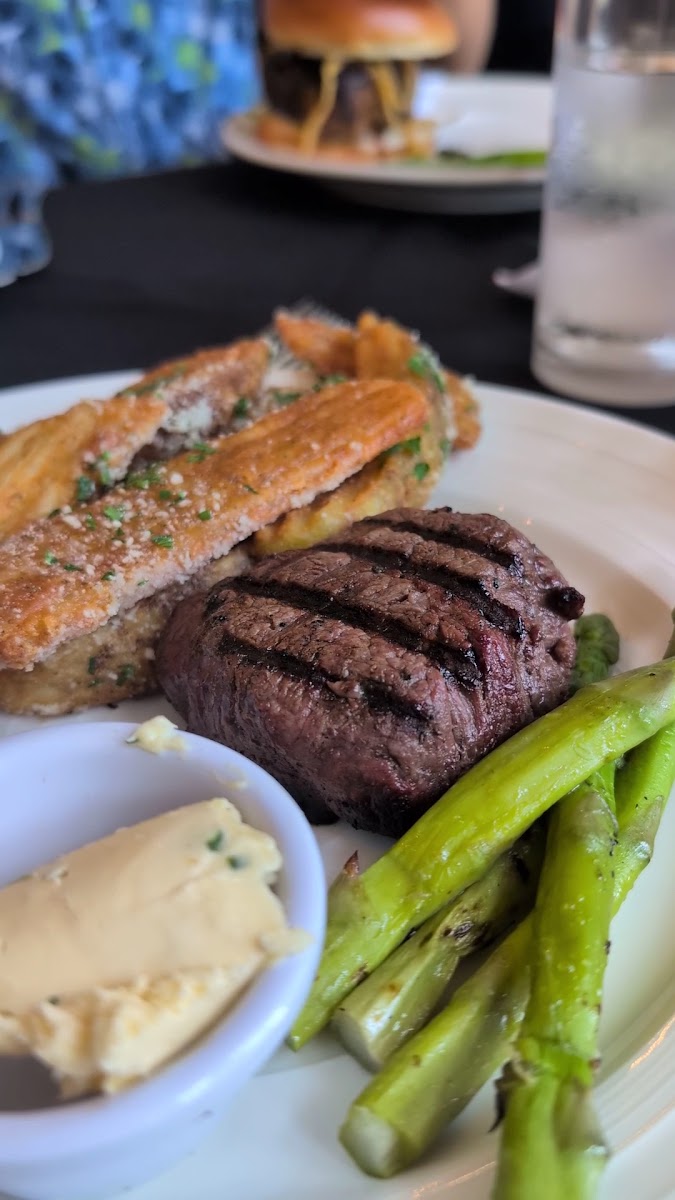 My wife ordered the fillet... And it was the most tender outstanding fillet I have eaten. Certainly on the top two. It was served with a reduced sauce... And I'm not a fan of putting sauce on any good steak... But it really worked. I ordered the scallops... They were grilled perfectly... The spinach salad was very good... And the peach trio for dessert... It was OK. overall... Fantastic evening... Great service. Highly recommend this establishment.